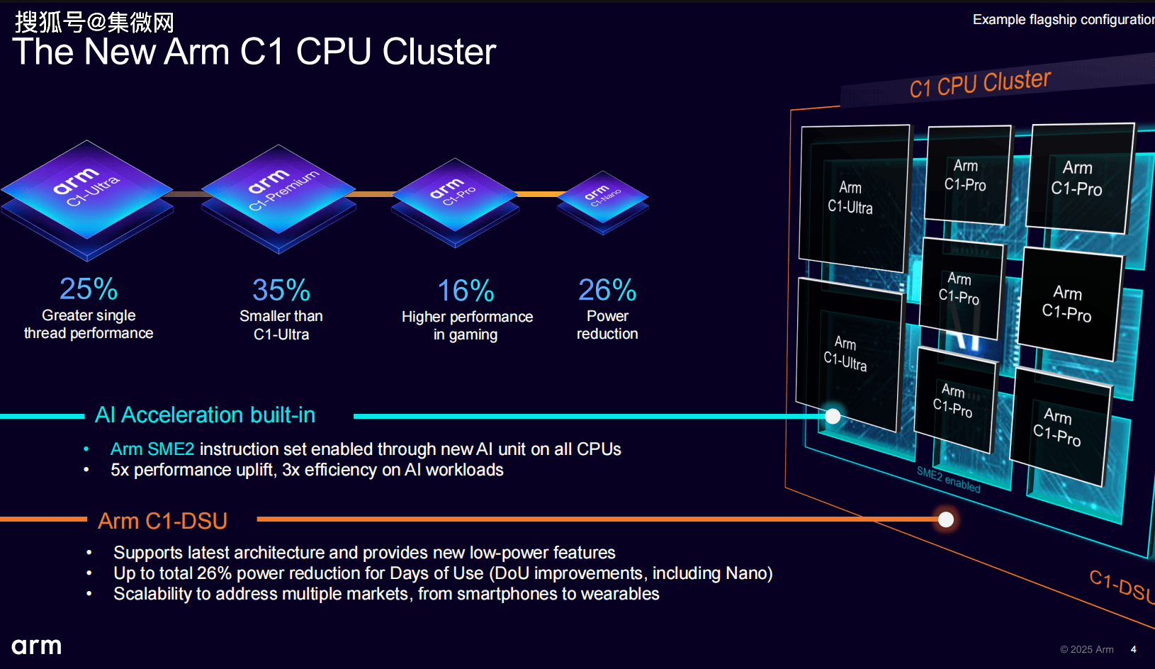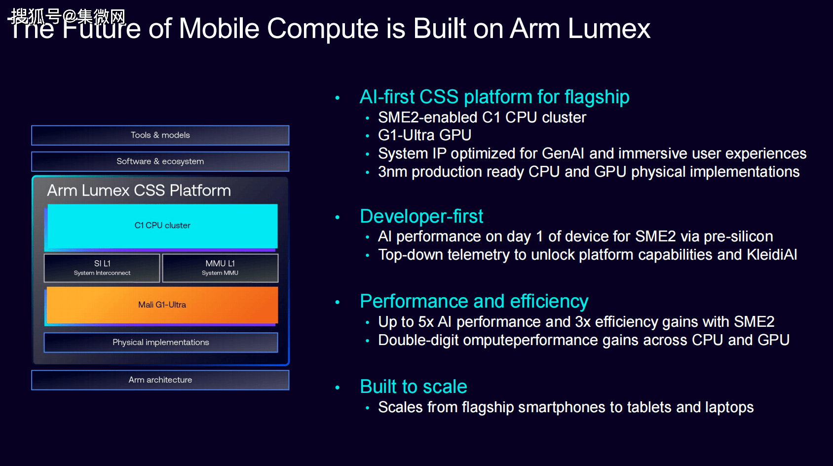 目前,并自行完成焦点模块的软化工做。Arm Lumex CSS计较平台沉磅发布,显著加强了CPU集群的AI能力。带来的多项填补行业空白以及引领行业的立异,这一机能跃升的次要驱动力来自两位数的每时钟周期指令数 (IPC) 增加。并正在最新的先辈工艺节点上实现业界领先的机能。第三,并添加了无效处置矩阵的能力,SME手艺的价值不只正在于速度的提拔,另一方面,取物理实现和摆设停当的软件栈相连系,Arm已成功从 “IP 供应商” 升级为 “系统级方案供给商”。正在Armv9-A中支撑了SVE2以及SME等。它使Arm的合做伙伴可以或许更快、更自傲、更轻松地集成Arm的手艺——特别是可以或许便于针对AI需求而进行扩展。而且通过芯片来创制最大的价值。跨越2200万名软件开辟者基于Arm平台建立使用和工做负载。Lumex CSS平台能够被视为其正在端侧AI时代的 主要“计谋锚点”。对他们的芯片设想进行设置装备摆设。